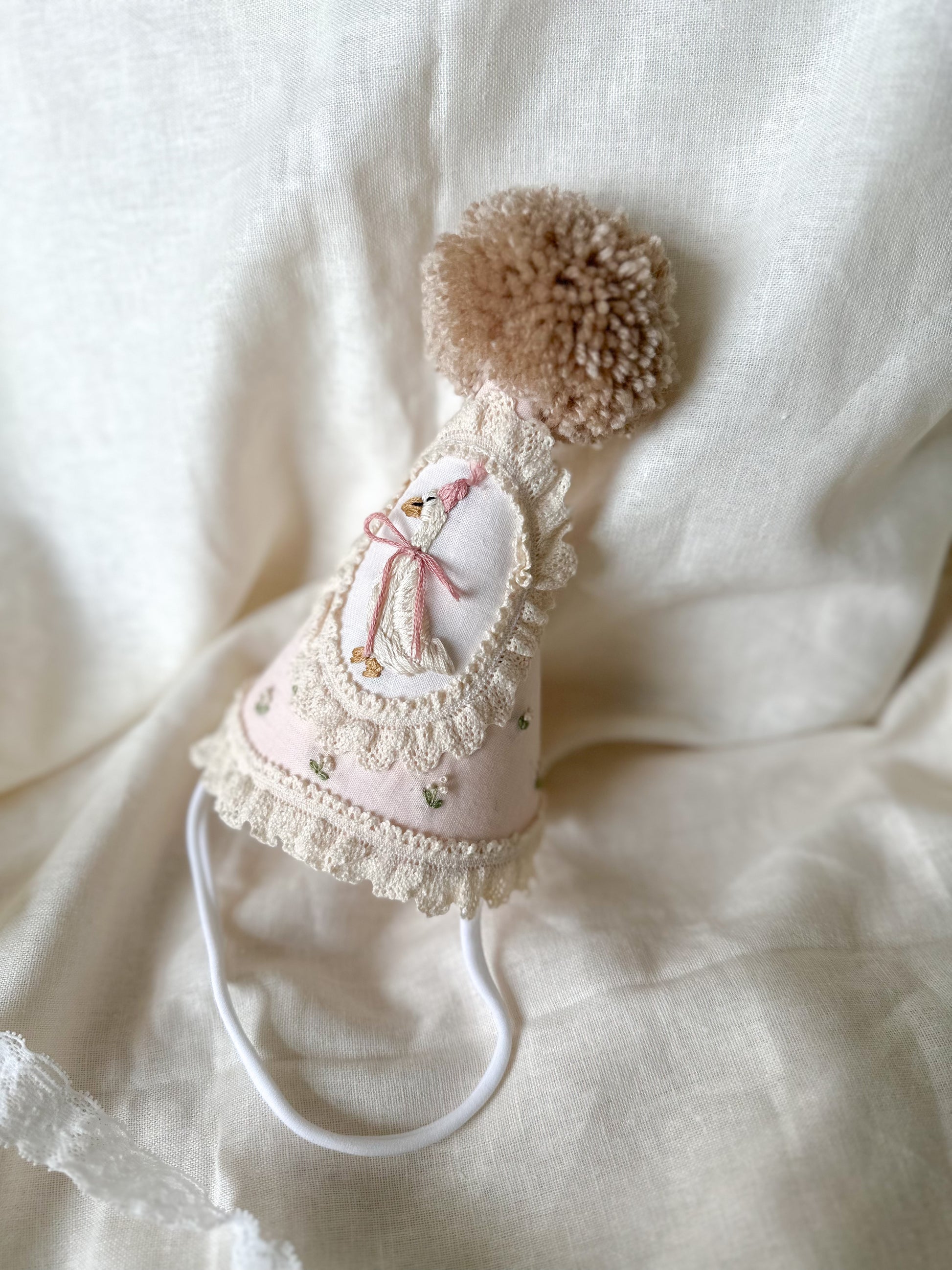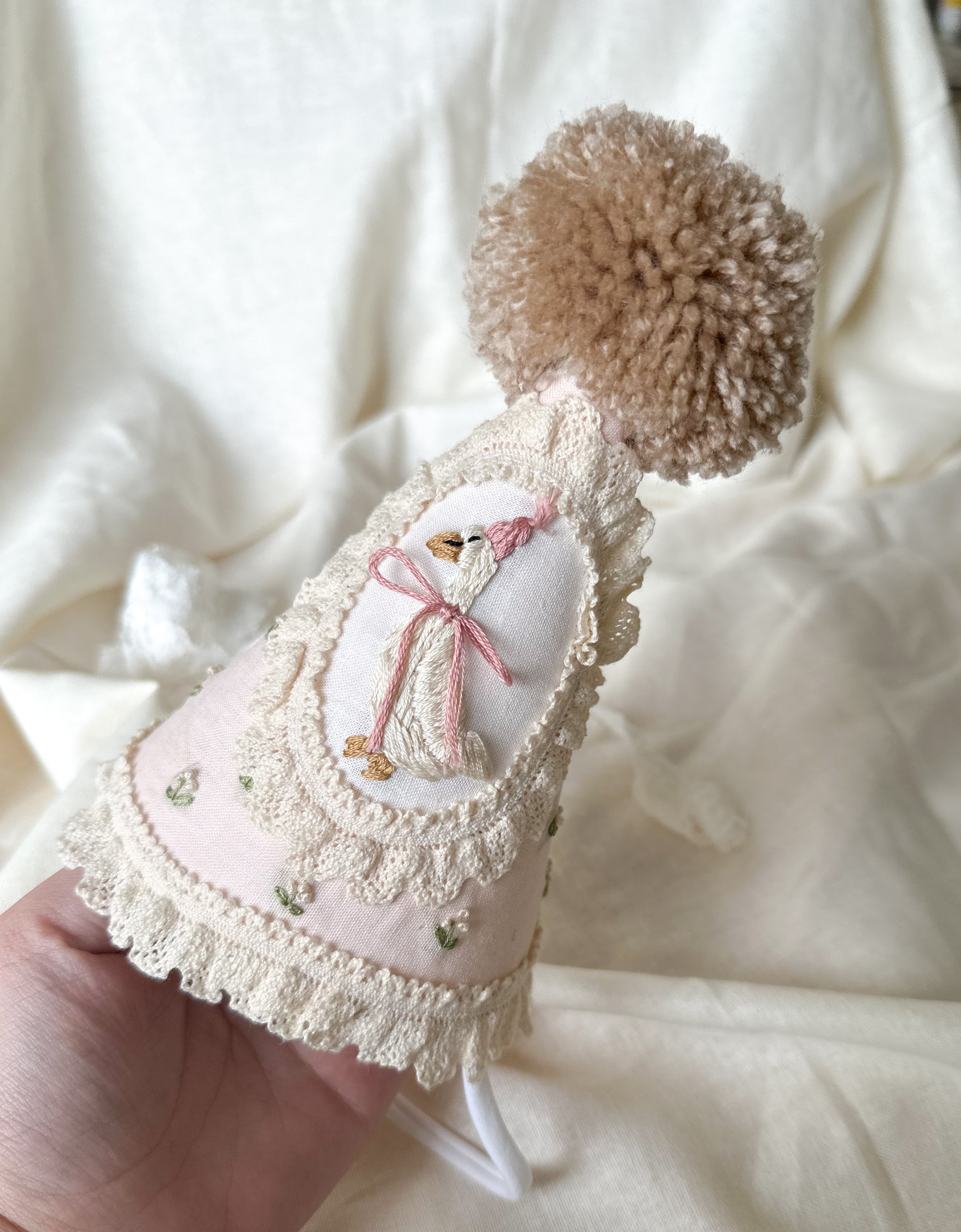 Floral detailing is around the entire hat, in the colours green and ivory buds. Made to treasure, whether that be for a birthday to wear year after year, or to gift. Your little one will wear it with love, and fall in love with the character goose called Betsy.