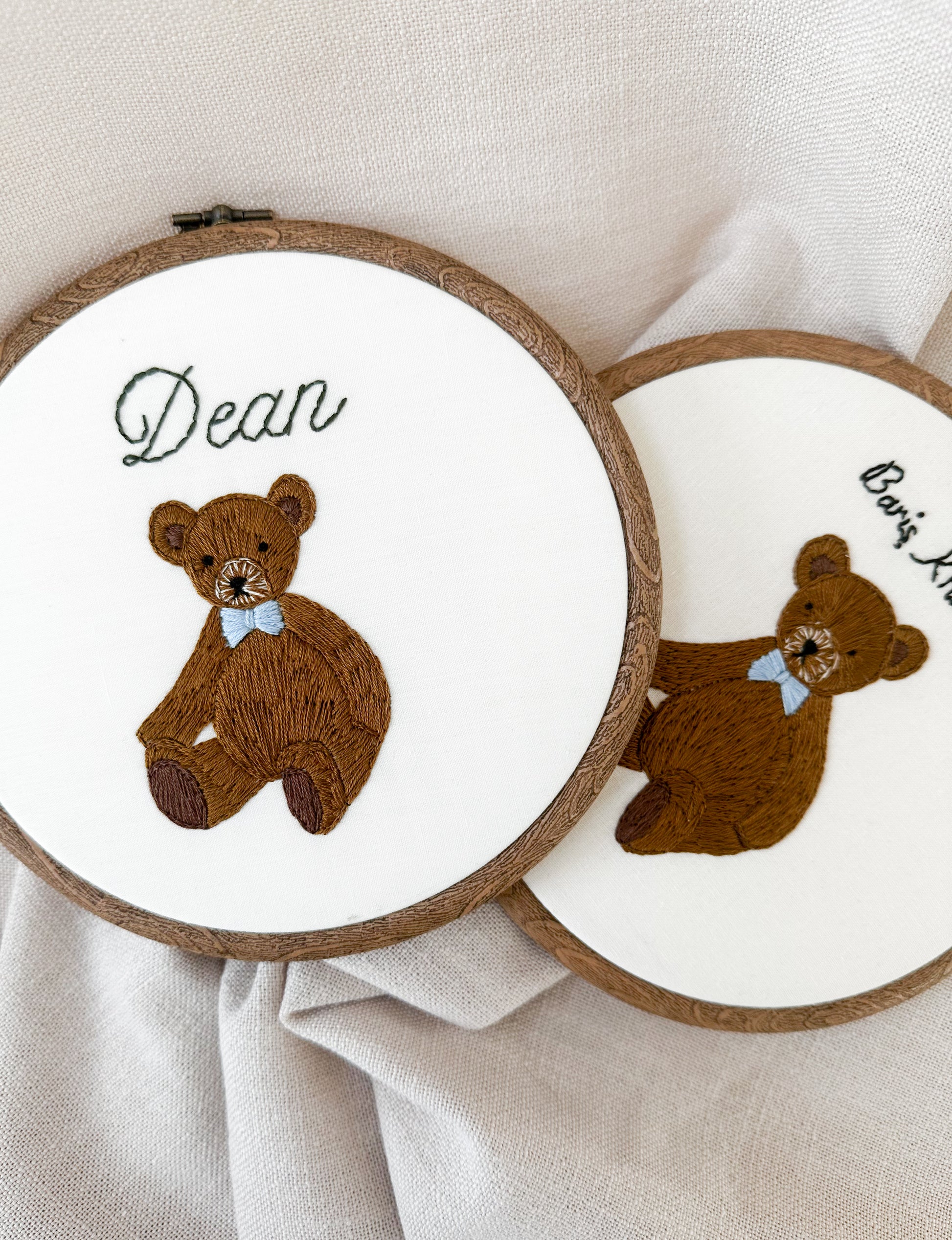 Our heirloom named Teddy Bear embroidery hoop is hand embroidered to be a keepsake you will most certainly forever cherish.